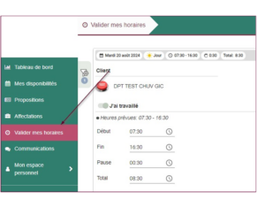 Ouvrez la section « Valider ses horaires ». Les horaires des missions passées seront alors affichés, vous permettant de consulter facilement les horaires demandés par le cadre.