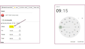 • Modification avec l’horloge : Si vous préférez, vous pouvez également cliquer sur l’icône de l’horloge à côté de l’horaire. Cette action ouvrira un sélecteur d’heure où vous pourrez ajuster les heures et les minutes selon vos besoins.